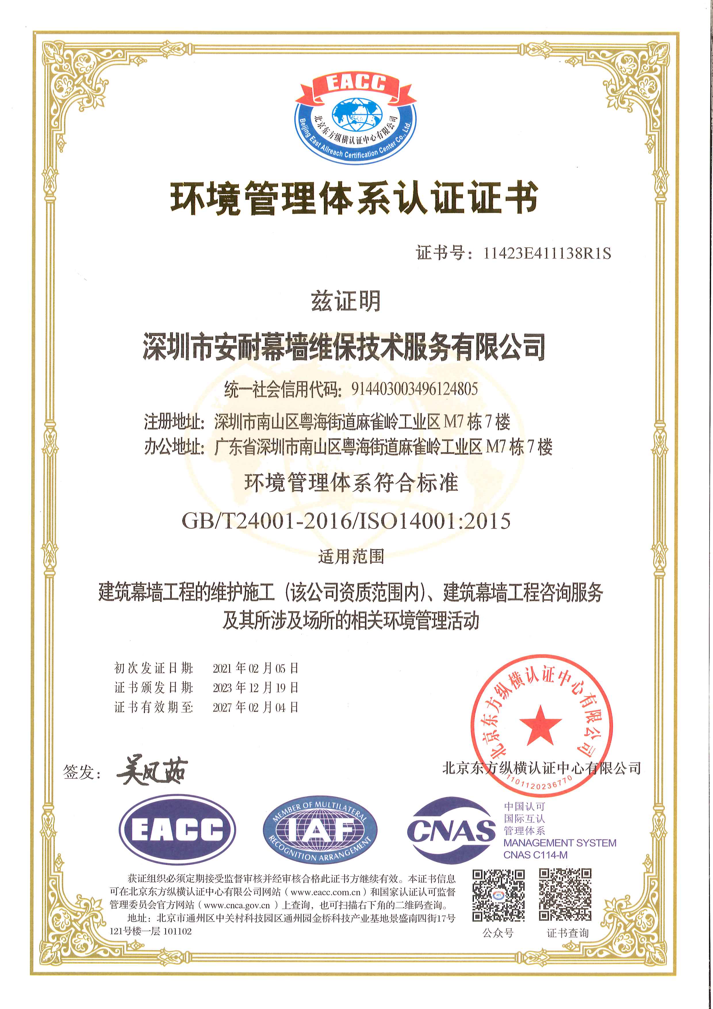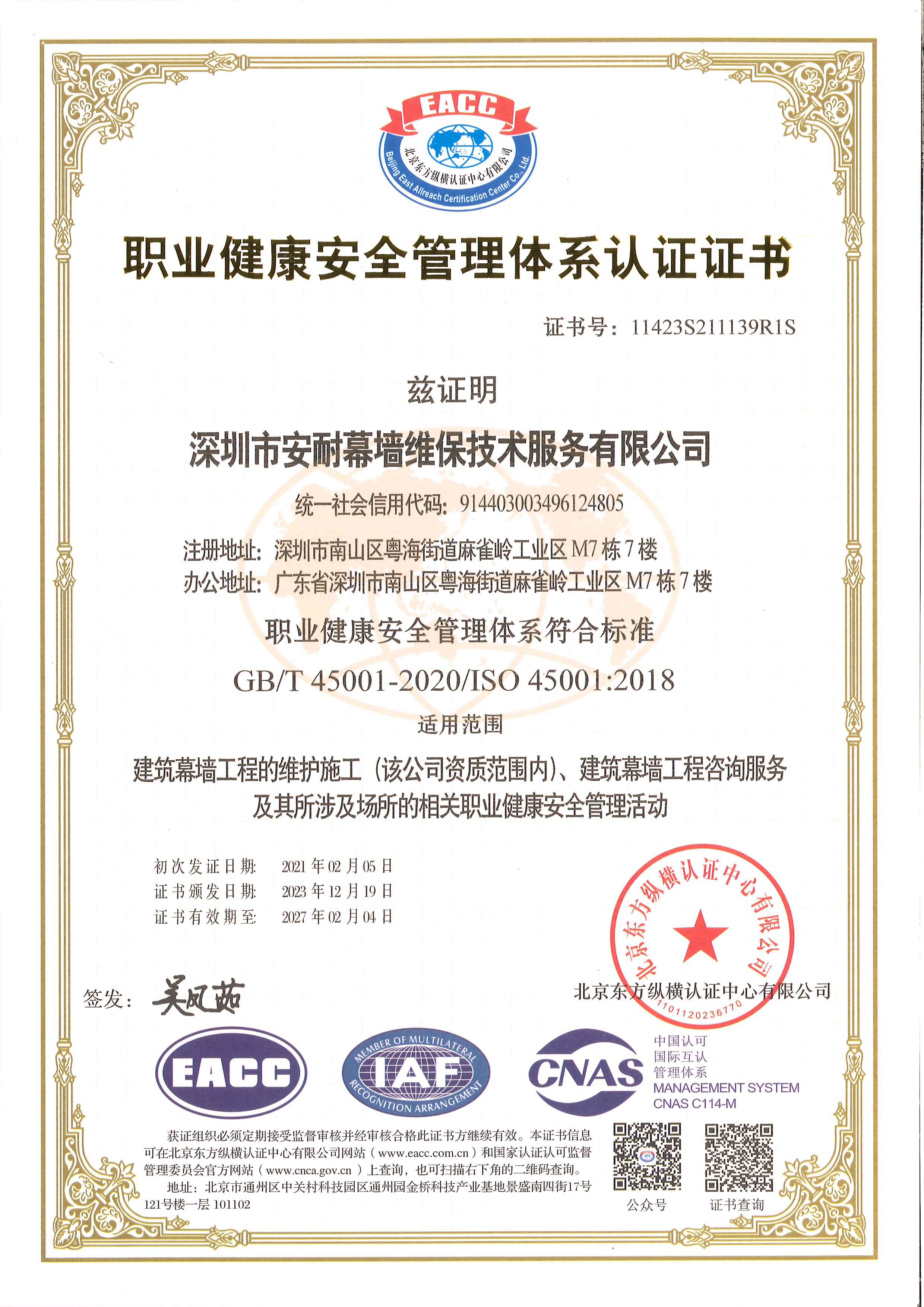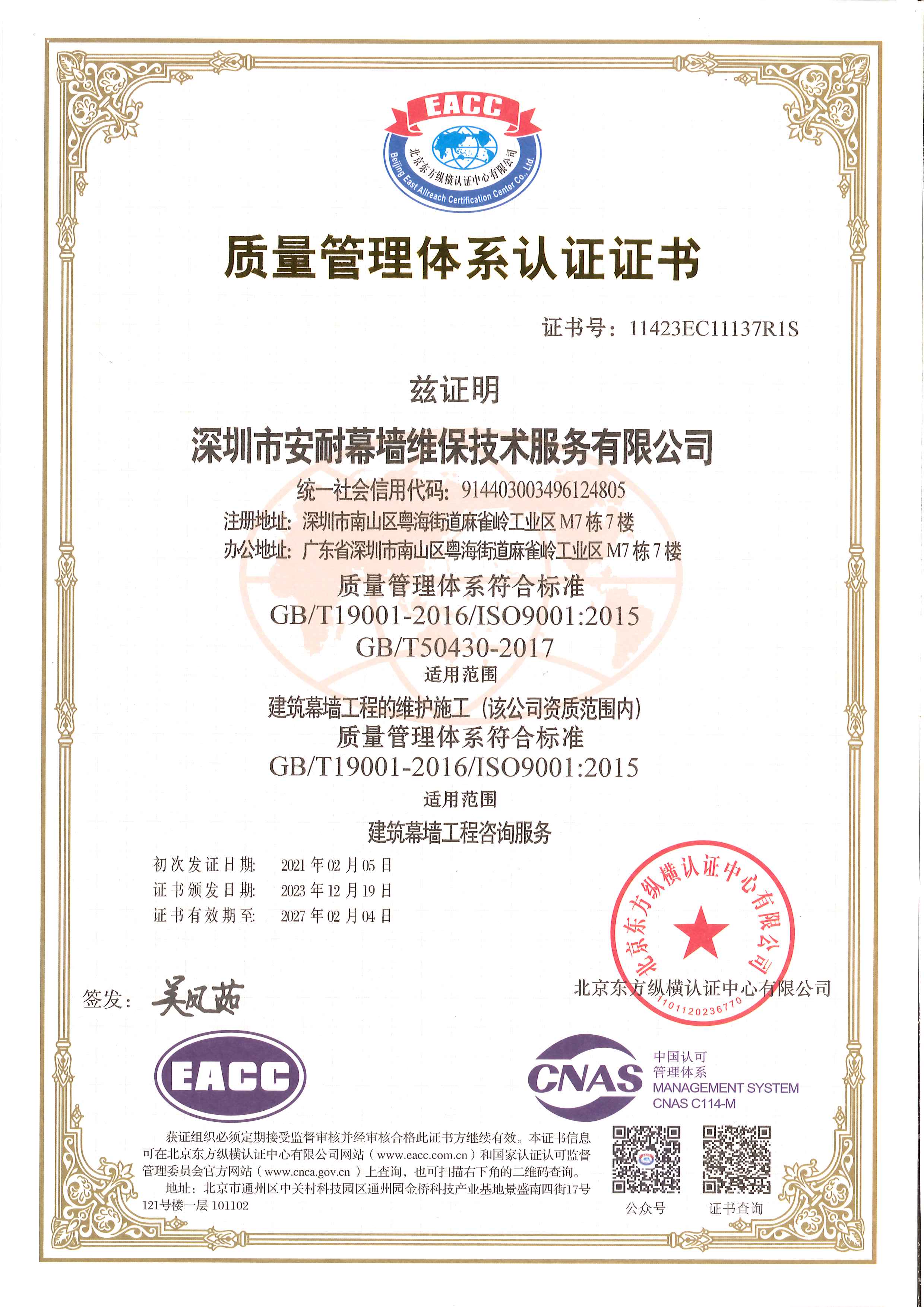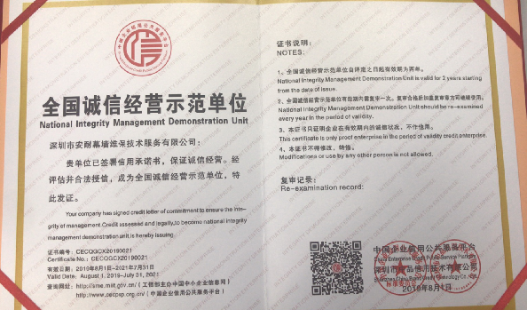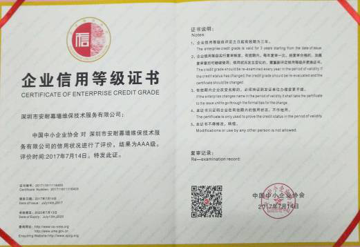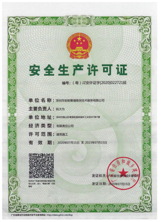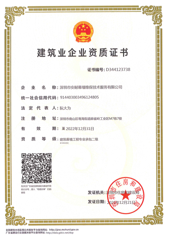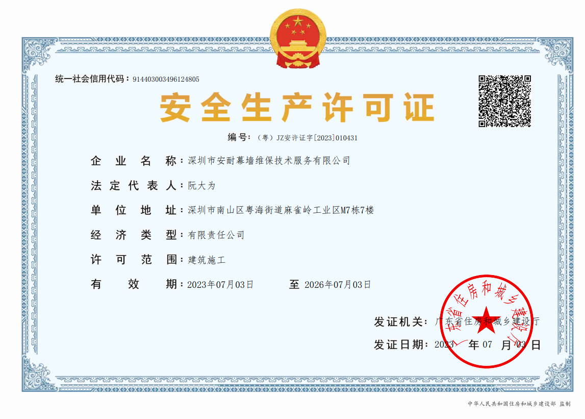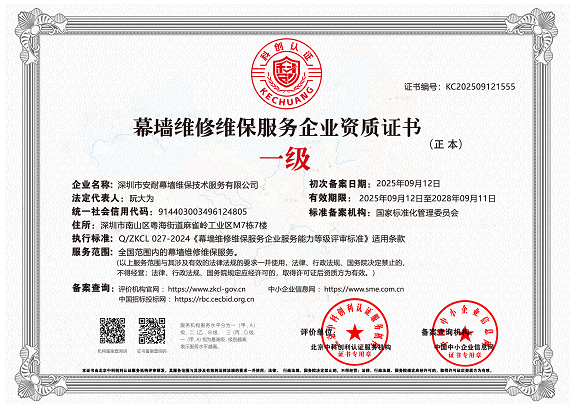 深圳市安耐幕墻維保技術(shù)服務(wù)有限公司,成立于 2015 年 7月,是一家擁有建筑幕墻施工二級資質(zhì),外墻清洗一級資質(zhì),屬于全國誠信示范經(jīng)營單位,企業(yè)信用評價(jià) AAA 級信用企業(yè),深圳市幕墻學(xué)會(huì)理事會(huì)員單位,深圳市建筑運(yùn)營專業(yè)委員會(huì)委員資格,深圳市綠色建筑協(xié)會(huì)會(huì)員單位,建筑幕墻耐撞擊性能分級及檢測方法 GB/T 38264-2019 主要參編單位,具有廣東省建設(shè)廳頒發(fā)的安全生產(chǎn)許可證, 具有《環(huán)境管理》《職業(yè)健康安全管理》《質(zhì)量管理》三大體系論證證書。公司主要從事幕墻和玻璃相關(guān)工程的技術(shù)咨詢服務(wù)、施工安裝、既有幕墻的日常維護(hù)和保養(yǎng)服務(wù)的專業(yè)公司。業(yè)務(wù)包括幕墻玻璃、石材、鋁板更換,玻璃、石材、鋁板幕墻改造與施工,玻璃幕墻與采光頂?shù)穆┧S修處理、高空玻璃更換維修、外墻翻新改造,各類門窗幕墻節(jié)能與開窗改造、既有幕墻安全檢查、幕墻燈箱廣告以及電動(dòng)窗維修更換與幕墻門窗工程施工等。面對高空作業(yè)的工作風(fēng)險(xiǎn)與復(fù)雜多變的幕墻系統(tǒng),始終本著“安全第一,服務(wù)耐久”的經(jīng)營方針,全心全意為客戶提供優(yōu)質(zhì)服務(wù)。